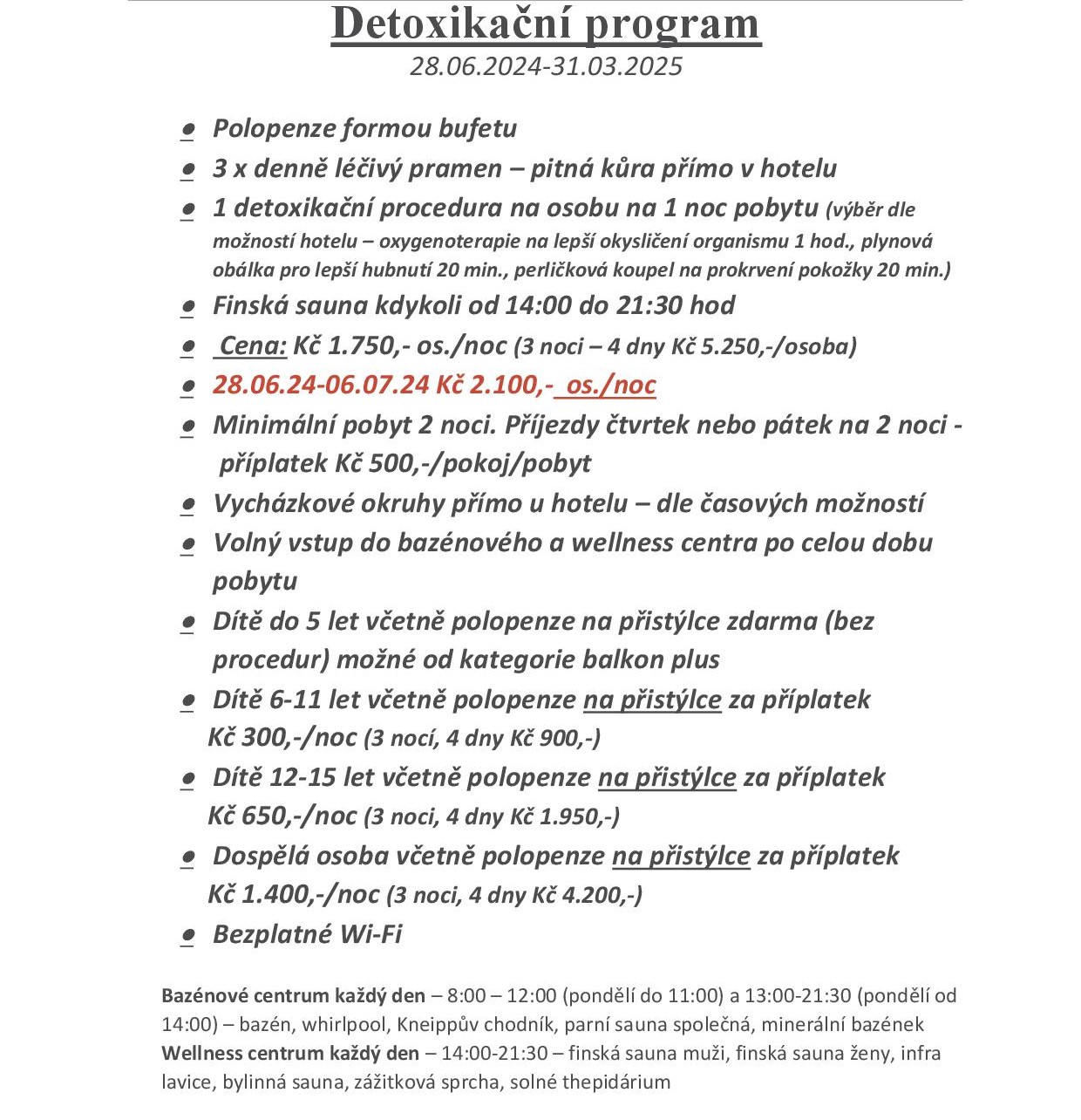Hotelové bazénové a wellness centrum: Součástí bazénového centra je bazén o velikosti 12,5×6,5 m, s teplotou vody 29st. C, vířivka, Kneippův chodník, společná parní sauna a bazének s vřídelní vodou. Ve wellness centru, které přímo navazuje na bazénové centrum, se nachází dvě finské sauny odděleně pro muže a ženy, společná bylinná sauna a solné tepidarium, ledová studna a infra-lavice.