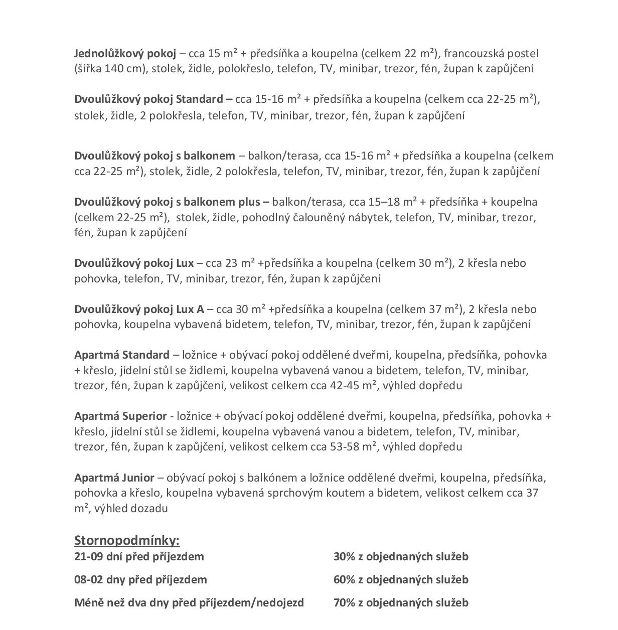 Pokoje: každý pokoj je vybaven satelitní televizí, telefonem, ledničkou a trezorem, fénem, županem. typy pokojů